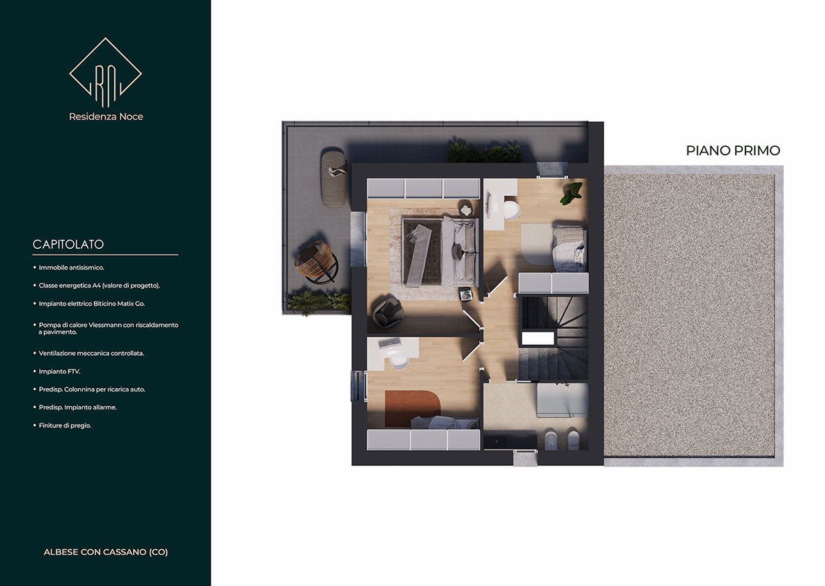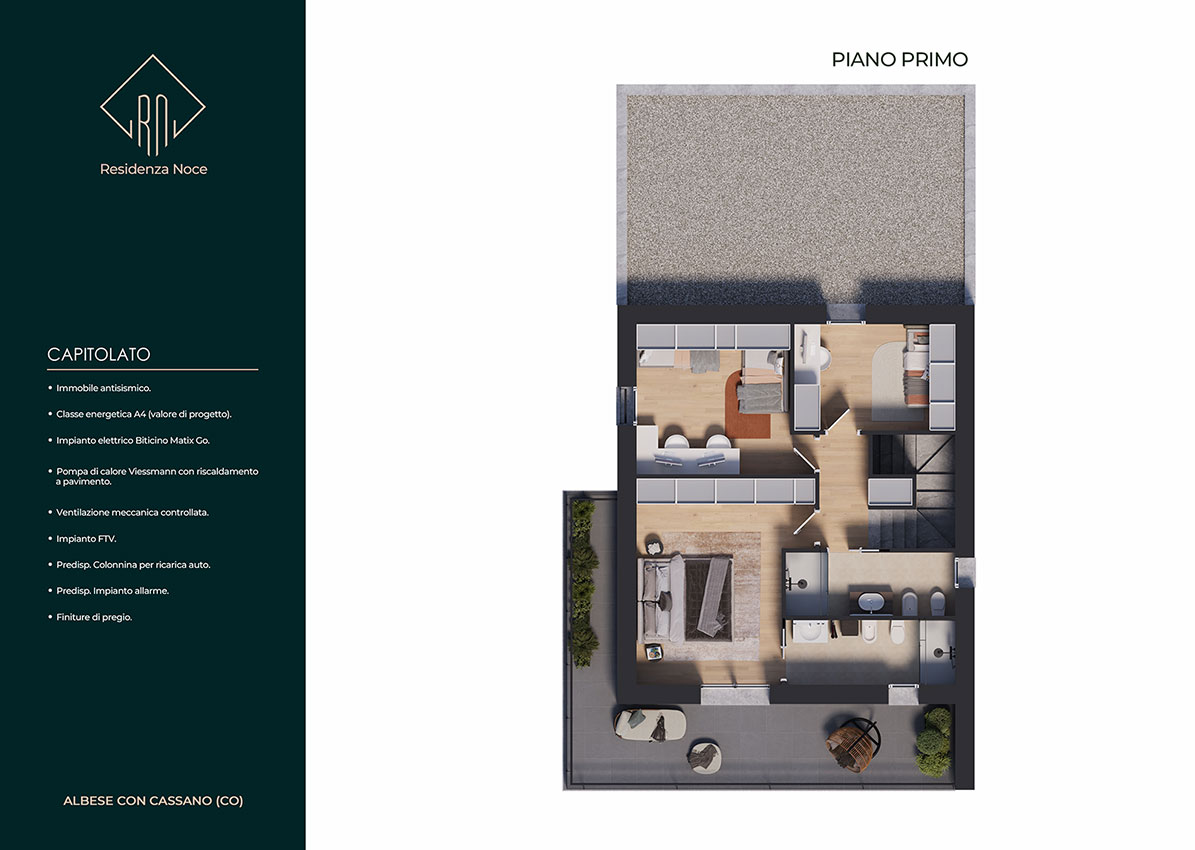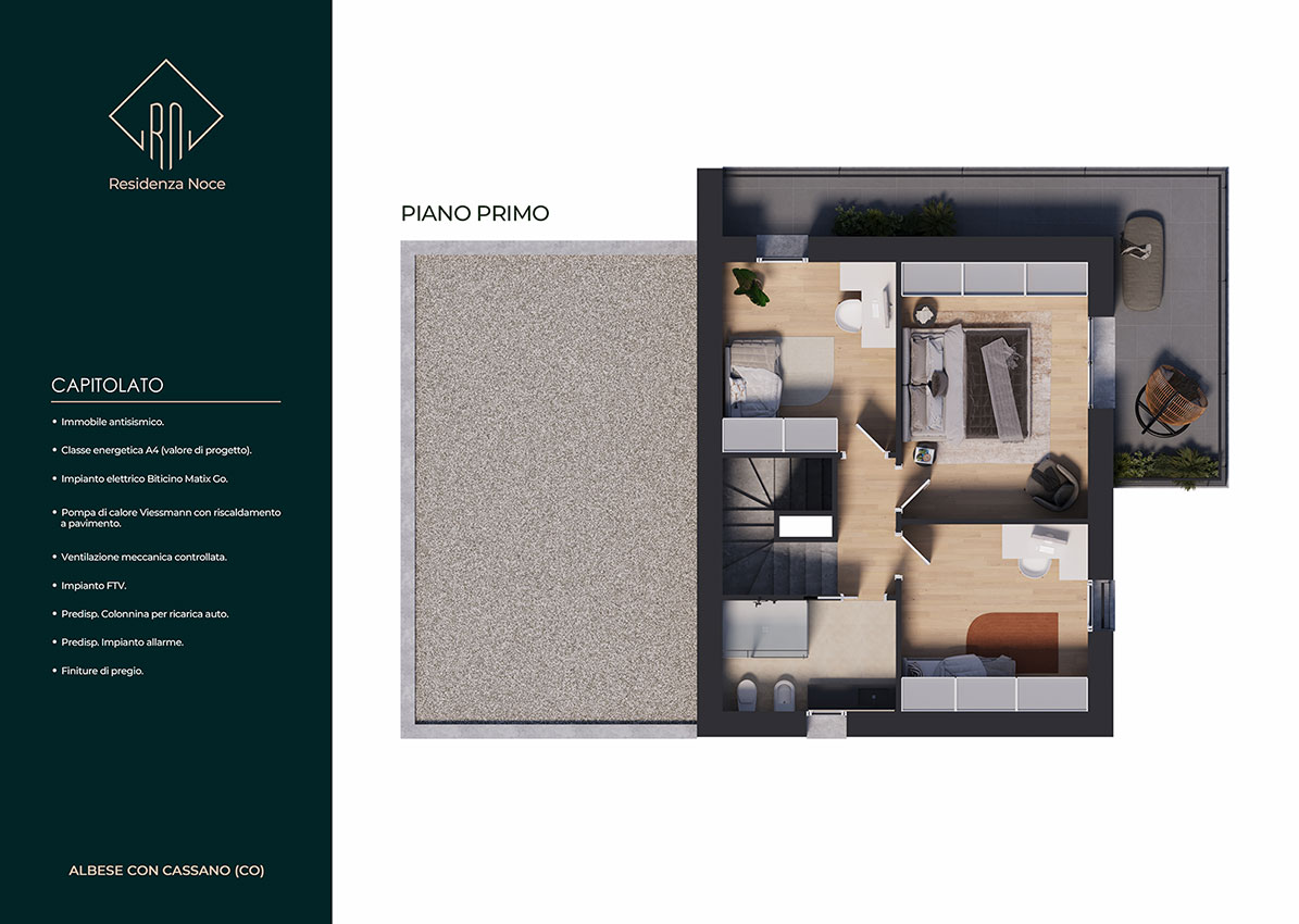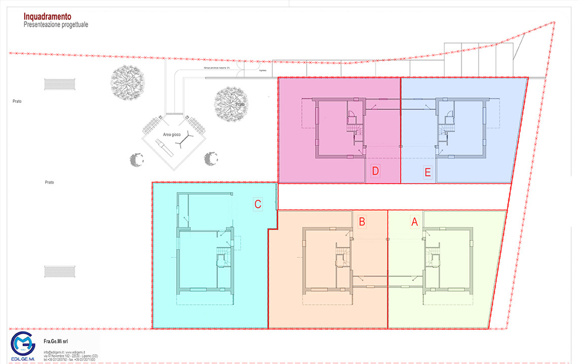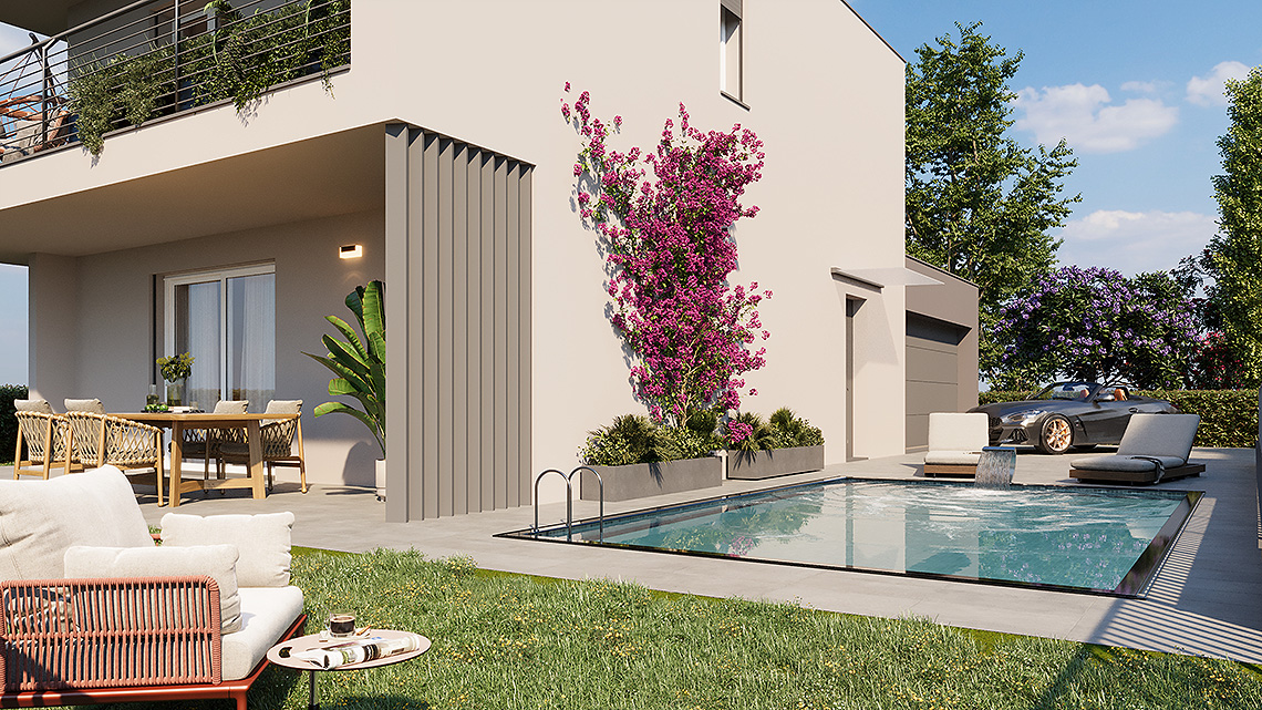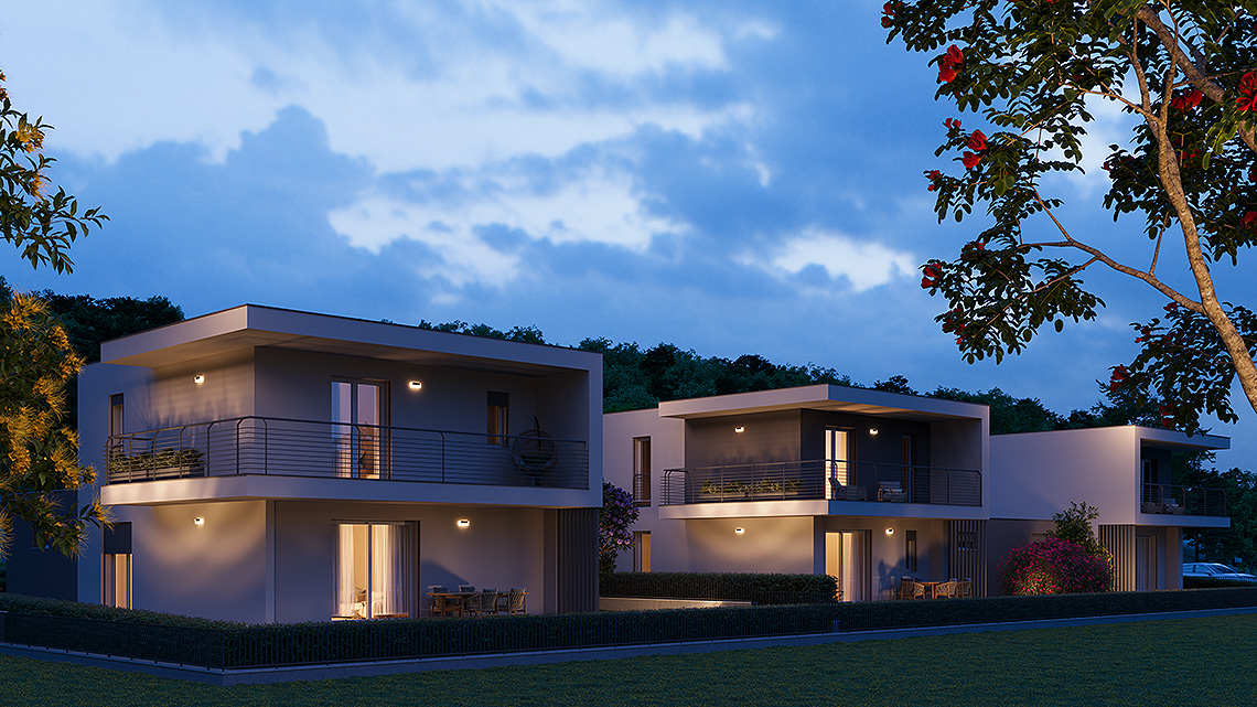 La soluzione progettuale prevede la realizzazione di N. 5 ville di pregio con elevate prestazioni energetiche ed immerse nel verde. L' architettura, il sistema costruttivo, le tecnologie impiantistiche e le finiture, rendono questo progetto innovativo, unico nella sua tipologia e attualmente presente sul mercato. L’ orientamento, gli accessi e l’ esposizione fanno sì che tutte le unità godano di assoluta privacy e indipendenza. Le metrature, i locali, gli spazi esterni vivibili e gli accessori rendono ogni unità confortevole e adattabile ad ogni tipo di famiglia. Ogni villa si sviluppa su due piani abitativi ed è composta da un ingresso, un’ ampia zona giorno living, disimpegno, w.c., portico e giardino al piano terra, da tre camere da letto ampie, disimpegno, w.c. e terrazzo al piano primo.