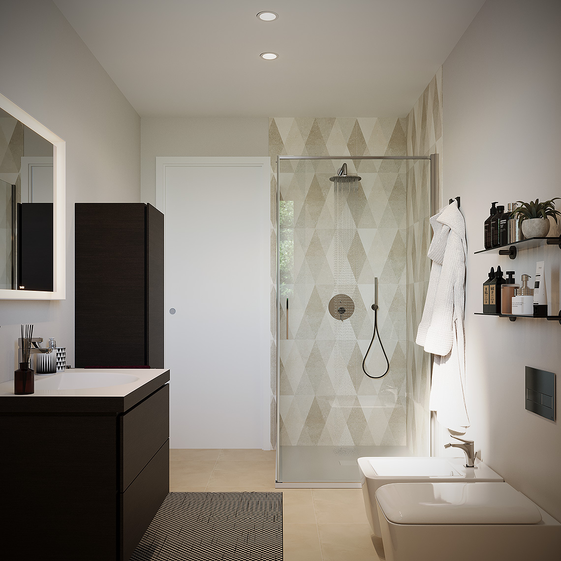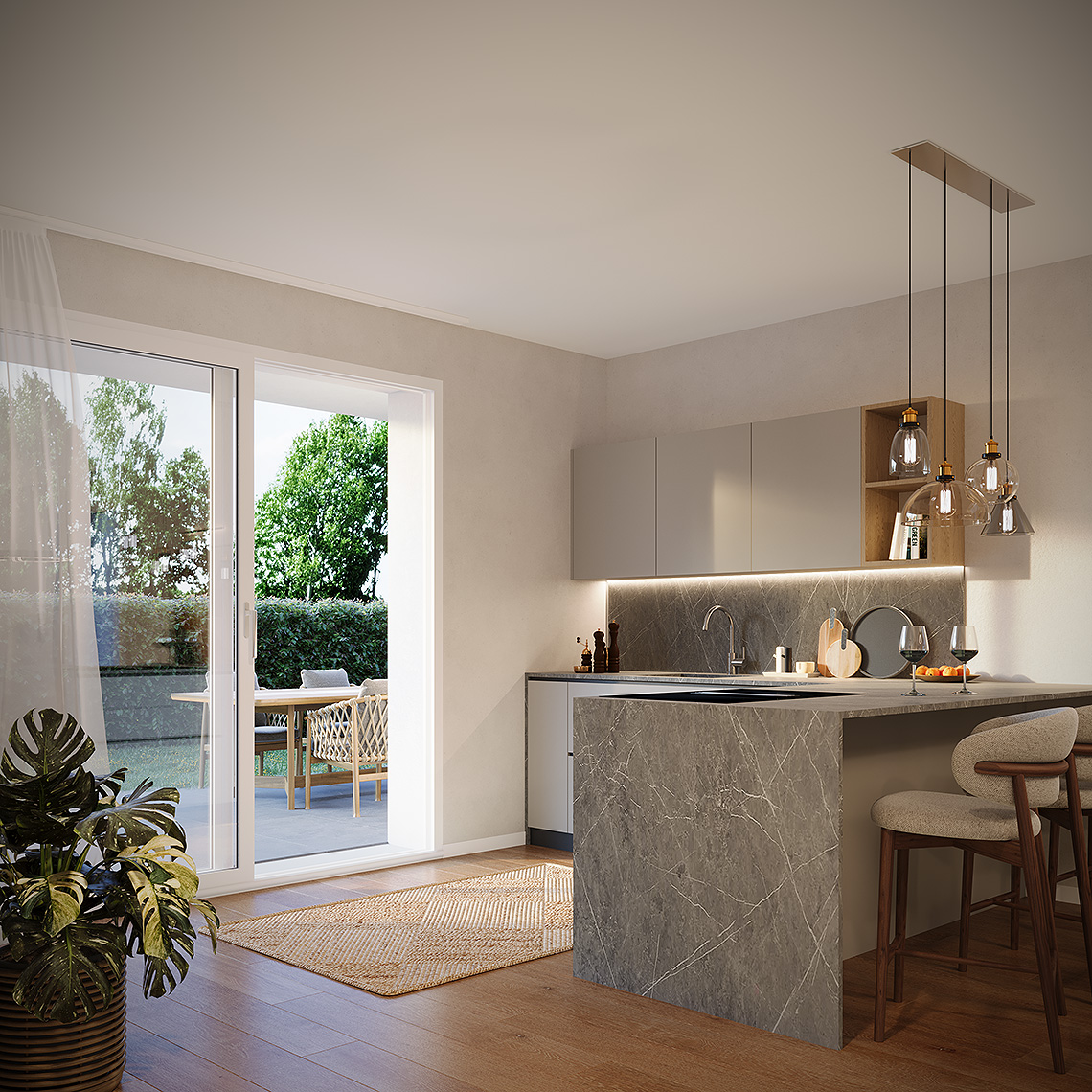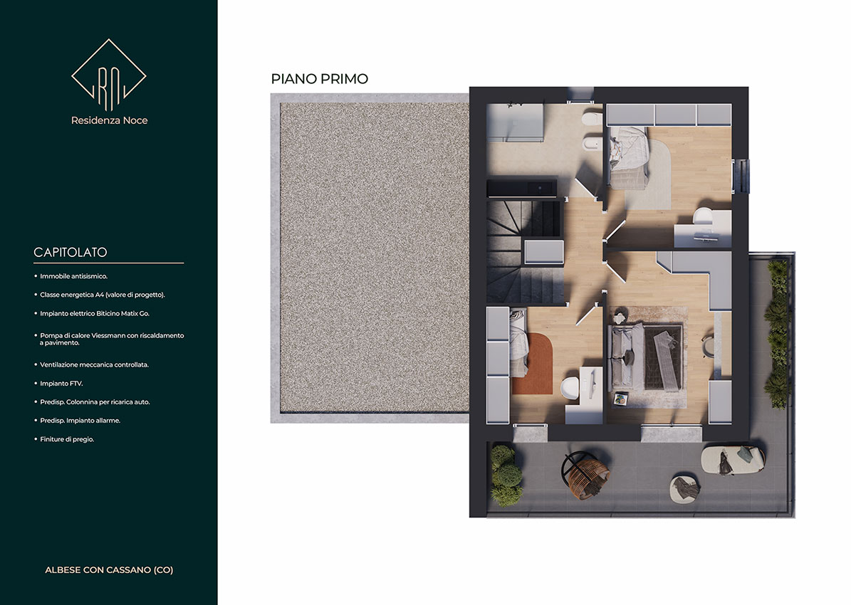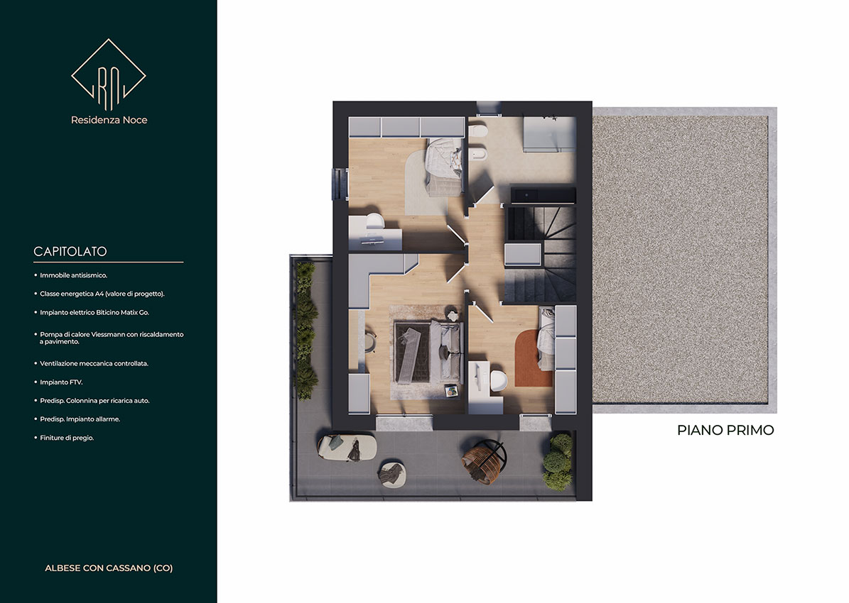 La soluzione progettuale prevede la realizzazione di N. 5 ville di pregio con elevate prestazioni energetiche ed immerse nel verde. L' architettura, il sistema costruttivo, le tecnologie impiantistiche e le finiture, rendono questo progetto innovativo, unico nella sua tipologia e attualmente presente sul mercato. L’ orientamento, gli accessi e l’ esposizione fanno sì che tutte le unità godano di assoluta privacy e indipendenza. Le metrature, i locali, gli spazi esterni vivibili e gli accessori rendono ogni unità confortevole e adattabile ad ogni tipo di famiglia. Ogni villa si sviluppa su due piani abitativi ed è composta da un ingresso, un’ ampia zona giorno living, disimpegno, w.c., portico e giardino al piano terra, da tre camere da letto ampie, disimpegno, w.c. e terrazzo al piano primo.